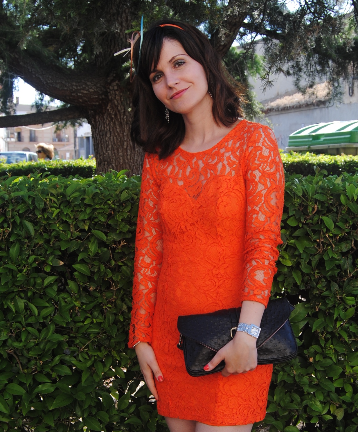 ¡Hola a todos! Este es mi look para la boda de una amiga celebrada hace unos días. Elegí un color muy chulo para el vestido (corto pero con manga larga, todo cubierto de encaje): el naranja. Pero, sobre todo el look, adoro esta diadema diseñada por mi querida amiga, Sandra Romero. Deberíais de visitar su página web (algomásquetocados) porque encontraréis verdaderos tesoros. ¡Creédme! Espero que os guste el outfit. Gracias por la visita.
